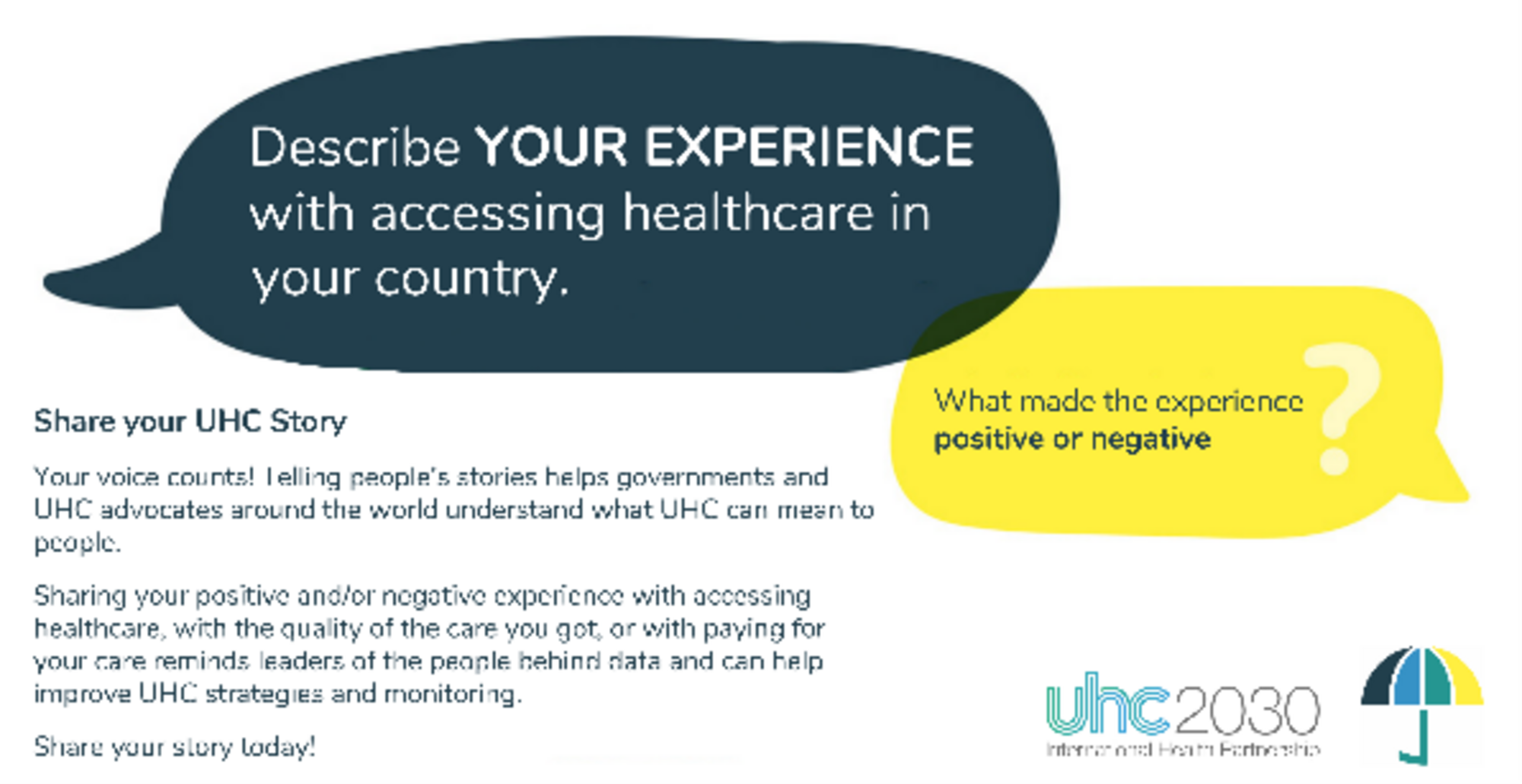Partagez votre expérience positive et/ou difficile en matière d’accès aux services de santé, de qualité des soins que vous avez reçus ou de paiement des soins pour rappeler aux dirigeants que les chiffres cachent de véritables personnes et pour contribuer à améliorer les stratégies et la mise en œuvre en vue de la réalisation de la CSU.