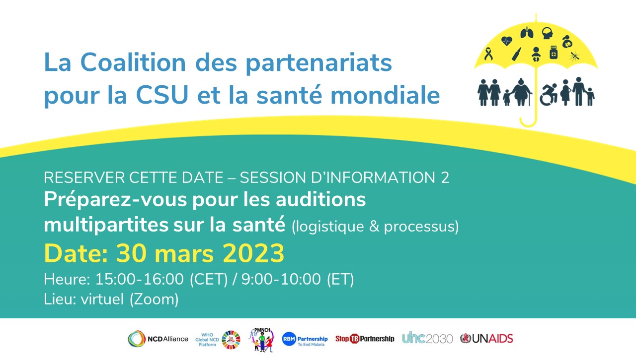 La Coalition des partenariats pour la CSU et la santé mondiale vous invite à participer à une deuxième séance d'information le 30 mars 2023, avant l'audition multipartite pour les réunions de haut niveau des Nations Unies (UN HLM) liées à la santé.
